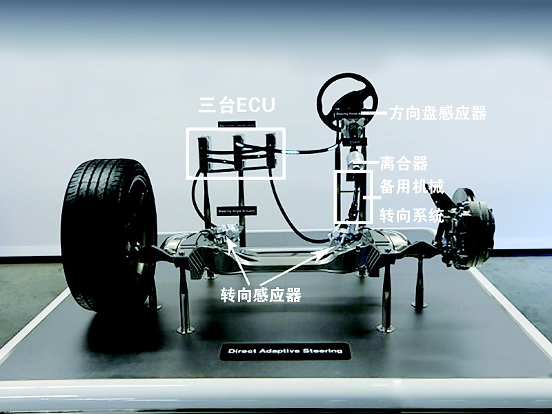 这套线控转向系统的构成与传统转向系统结构类似,也是由方向盘、转向柱、转向机组成。不同之处在于它多了3组ECU电子控制单元、方向盘后的转向动作回馈器、离合器。